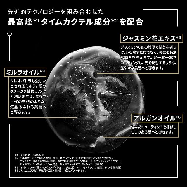 【美髪の最高峰*1。全方位ケアで、時を超えてさらなる美の高みへ】全方位美髪ケアで、自分史上最高の美髪へ。 先進的テクノロジーを組合せた「最高峰タイムカクテル」成分配合*2。厳選された香料高配合*3。*1:ケラスターゼにおいて*2:アルガニアスピノサ核油(保湿・補修)、オオバナソケイ花エキス(コンディショニング成分)、モツヤクジュ樹脂エキス(毛髪保護)、トリ(カプリル酸/カプリン酸)グリセリル(コンディショニング成分)、ジメチコン(コンディショニング成分)、ジメチコノール(コンディショニング成分)*3:当社従来品比較