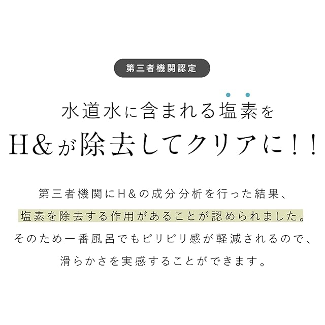 【水道水に含まれる塩素を除去】第三者機関にH&の成分分析を行った結果、塩素を除去する作用があることが認められました。そのため一番風呂でもピリピリ感が軽減されるので、滑らかさを実感することができます。