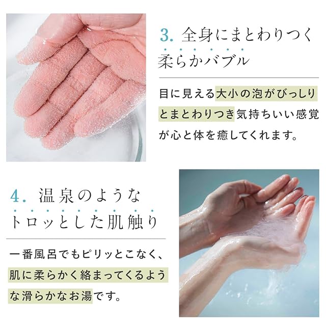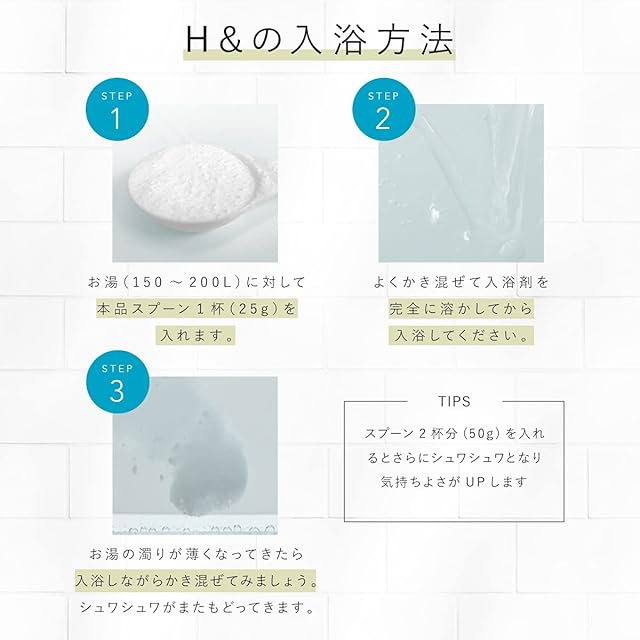 【入浴方法】よくかき混ぜて入浴剤を完全に溶かしてから入浴してください。お湯の濁りが薄くなってきたら入浴しながらかき混ぜてみましょう。シュワシュワがまたもどってきます。※約3時間を目安に入浴してください※白濁や気泡がなくなっても水素濃度は持続しますが、時間とともに減少します。