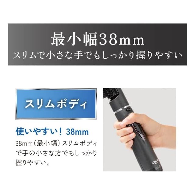 スリムボディ:約290gの軽さ、最小幅38mmの細型ボディで、手の小さな方でもしっかり握りやすく使いやすい設計です。