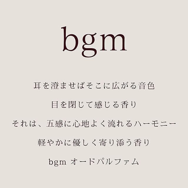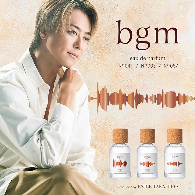 【Brand:ブランド】EXILE TAKAHIROプロデュース香水。喫茶店や美容室、アパレル店などシーンごとにテイストが違うそれぞれの空気感に溶け込むBGM。同じように「bgm」が手に取ってくださる方のライフスタイルや人生観に寄り添ってくれあある香りになるようにという思いがこめられたメンズフレグランスブランド。