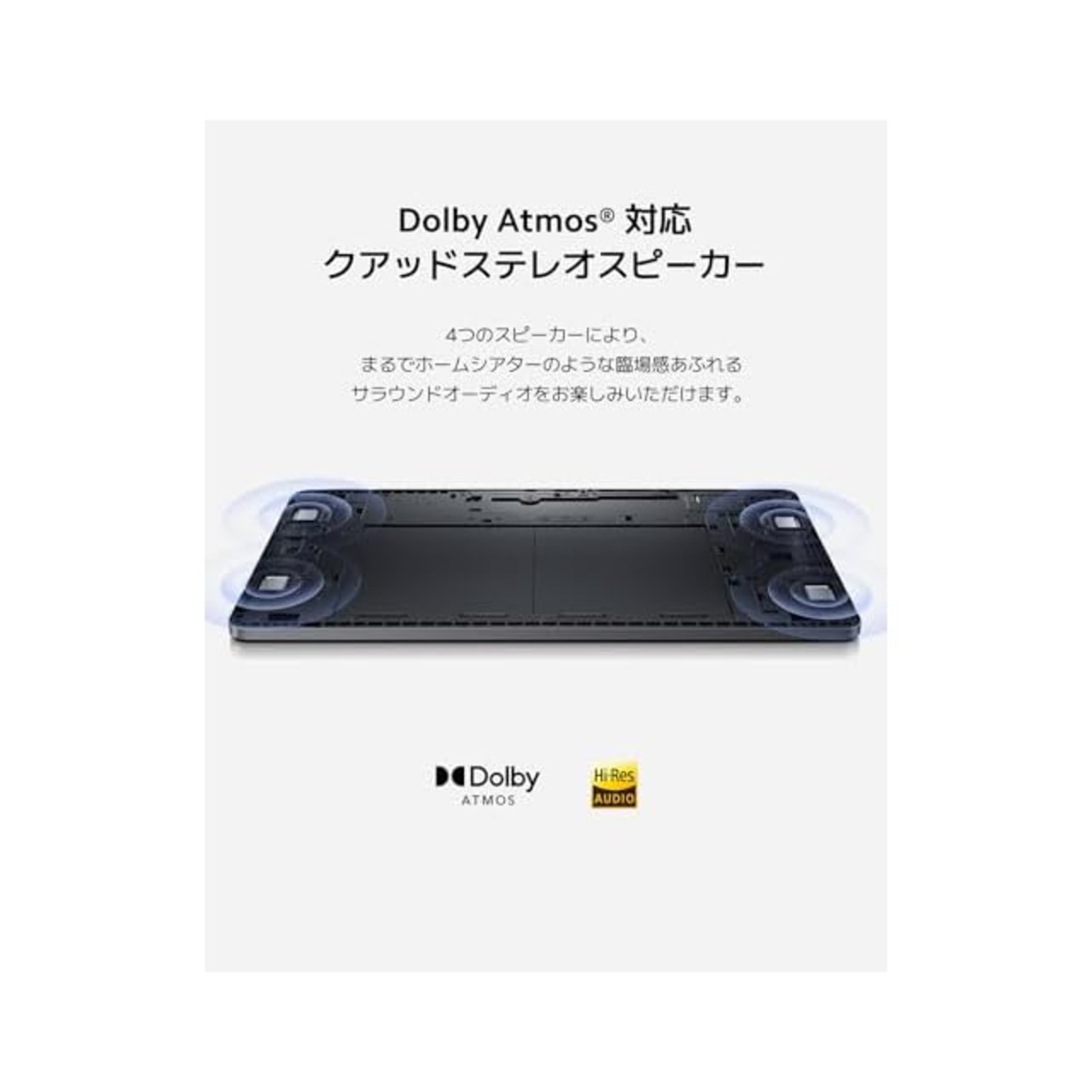 【どこでも感動の迫力サウンド】Dolby Atmos 対応クアッドスピーカー、4つのスピーカーにより、まるでホームシアターのような臨場感あふれるサラウンドオーディオをお楽しみいただけます。
