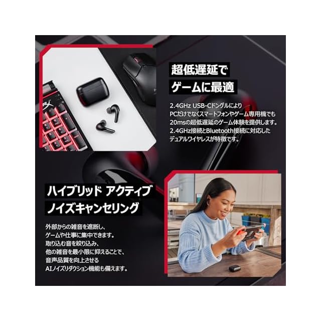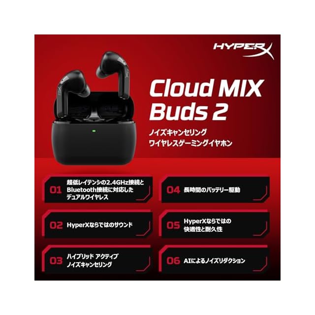 商品名:HyperX Cloud MIX Buds 2 ワイヤレス ゲーミングイヤホン ハイブリット型アクティブノイズキャンセリング(ANC) 2.4GHz 超低遅延20ms Bluetooth マイク付き 最大26時間バッテリー駆動 PC PS5 PS4 Switch Android 2年 7D0A4AA