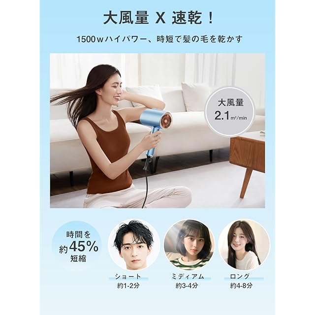 【圧倒的パワー&速乾体験】毎分20,000回転のハイパワーモーターを搭載し、2.1m3/分の大風量を実現。まるでヘアサロンの業務用ドライヤーのような力強い風で、髪の根元から一気に乾かします。忙しい朝も、寝る前のケアも、まさに「ドライ時間半分※」の感覚。※当社従来品比