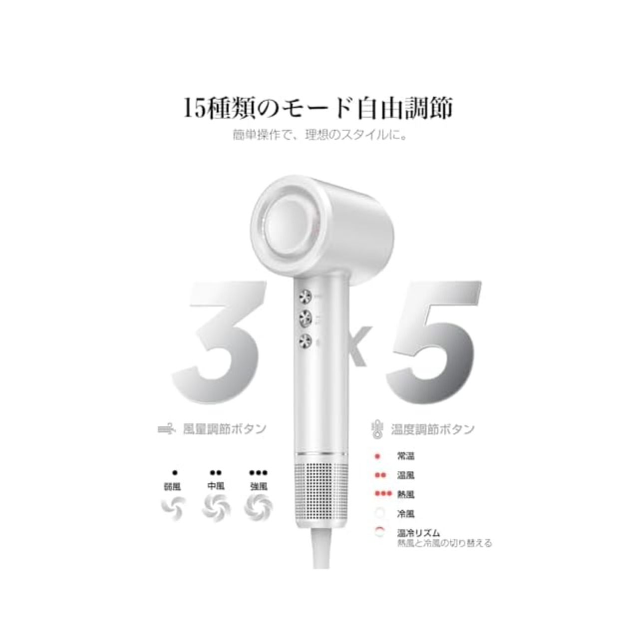 【3段階風量調節&5段階温度調節で、髪に最適なケアを実現】強・中・弱の3段階風量と、冷風・常温・温風・熱風・温冷リズム5段階の温度調節を搭載。さらに、温冷リズムモードで頭皮の健康をサポートし、髪質やスタイルに合わせた最適な設定が可能です。どんなシーンでも、プロのような仕上がりを簡単に叶えます。「温冷リズムモード:3秒長押し冷温熱風交替,赤色灯交替点滅」