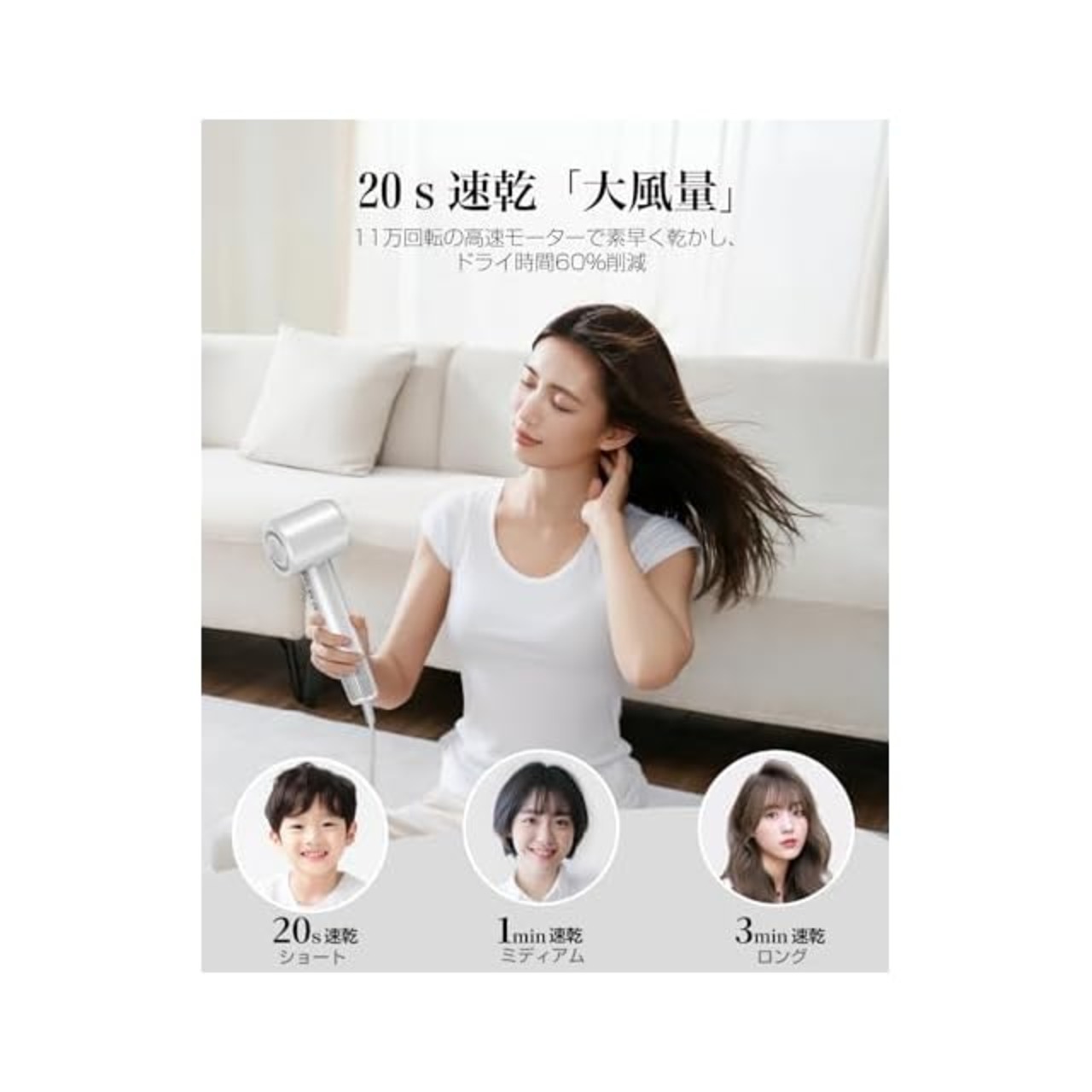 ? 【プロも認める超高速モーターで、ドライ時間を最大60%短縮】BGBの速乾ドライヤーは最新の高速デジタルモーターを搭載し、従来のヘアドライヤーを凌ぐ風量を実現!髪を素早く乾かすだけでなく、スタイリング時間も大幅に短縮。忙しい朝や急いでいる時にも、プロのような仕上がりを簡単に実現できます。