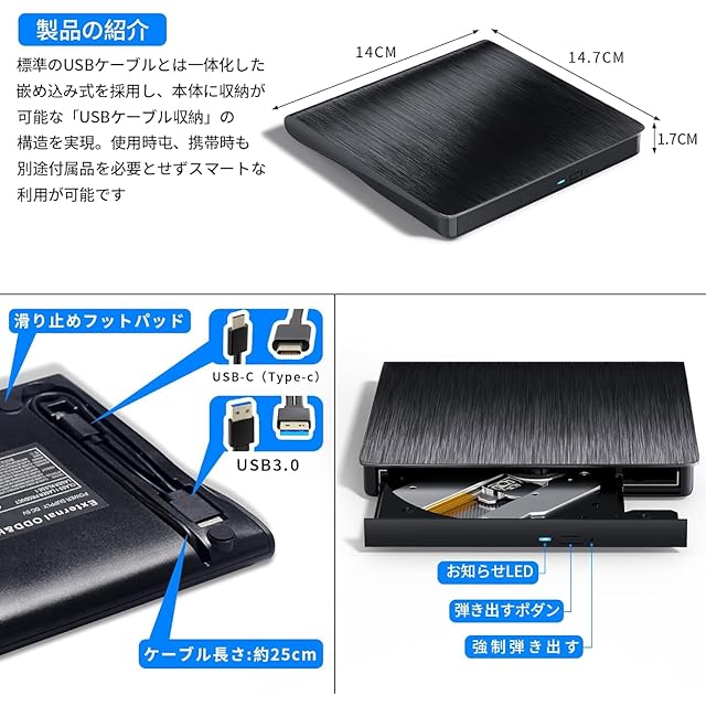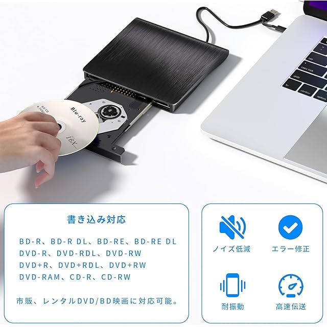 弊社のブルーレイ ドライブ外付けは、最大速度 5Gbps の高度な高速 3.0 インターフェイスを採用しており、従来の 2.0 (480Mbps) より 6 倍高速です。 またType-C (USB-C)端子ので、強力なエラー修正機能、耐衝撃性、低消費電力により、データ伝送が安定をしております。 ブルーレイドライブ外付け本体も薄くし、軽くし、また内蔵ケーブルは本体に収納できるので、アタッシュケースやカバンに入れ、持ち運びやすいです。事務やオフィス場合は、最適な弊社のブルーレイドライブ外付けをおすすめです。