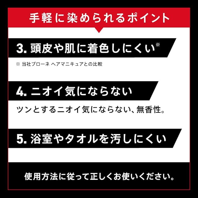 【お風呂で簡単5分ケア】髪に塗って、5分で流すだけ。 頭皮や肌に着色しにくく※3、お風呂やタオルも汚しにくい。 ツンとしたニオイが気にならない、無香性。※3 当社ブローネヘアマニキュアとの比較