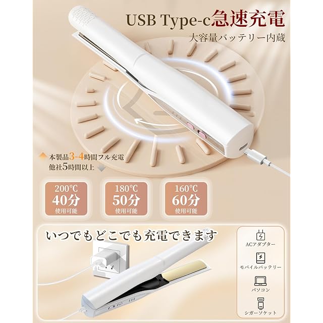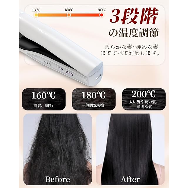 【セット内容と1年間の安心】パッケージ内容:コードレスヘアアイロン 本体×1、USB充電ケーブル×1、日本語取扱説明書×1。ご購入後1年間の品質がついております。万が一不具合が生じた場合やご不明な点がございましたら、お気軽にお問い合わせください。★注:充電中に加熱しないでください。