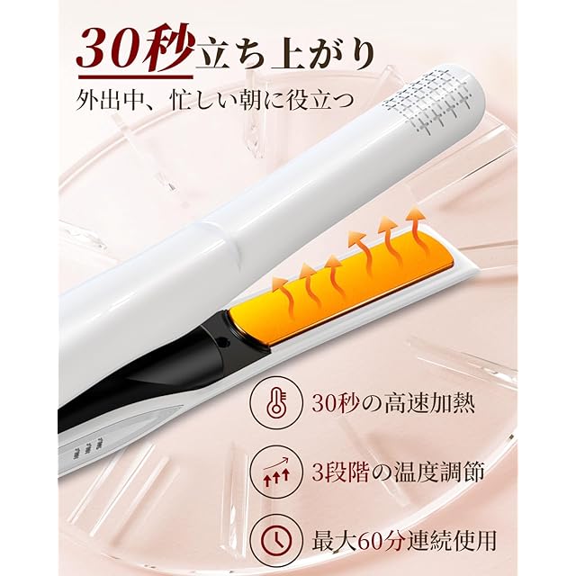 【30秒で立ち上がり・ コードレスヘアアイロン】Panovol ヘアアイロン コードレスはお忙しい朝やお出かけ先でも、スイッチを入れてわずか30秒でご利用いただけます。他社製品を上回る速さで温まるため、急な外出時でも素早くスタイリングが可能です。コードレス設計で、ケーブルの煩わしさがなく、いつでもどこでも自由に美しい髪をお約束します。★注:本製品は機内持ち込み不可です。