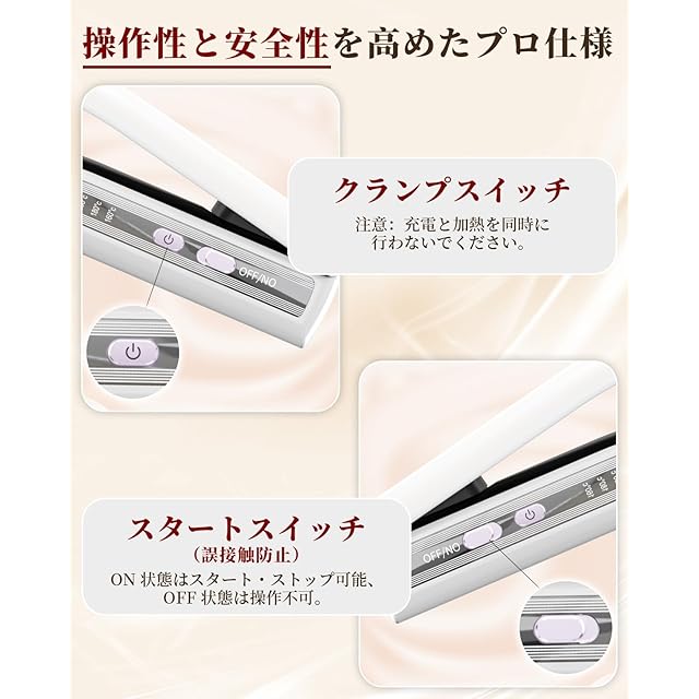商品名:【30秒で立ち上がり】 コードレス ヘアアイロン ストレート ミニ ヘアアイロン 3段階温度調整 2WAY カール/ストレート 誤起動防止ロック 自動電源OFF 大容量バッテリー マイナスイオン搭載 小型 電気髪ごて 持ち運び便利 男女兼用 家庭/旅行/出張/通勤 贈り物 日本語説明書付き ホワイト