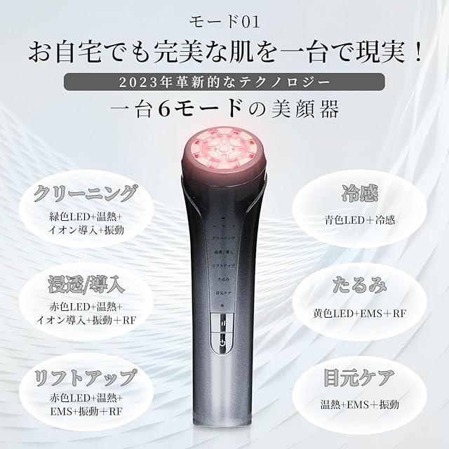 【6種類モード・3段階レベル】本製品は6種類モードがあります。①クリーニングモード:緑色LED+温熱+イオン導入+振動;②浸透/導入モード:赤色LED+温熱+イオン導入+振動+RF;③リフトアップモード:赤色LED+温熱+EMS+振動+RF;④たるみモード:黄色LED+EMS+RF;⑤目元ケアモード:温熱+EMS+振動;⑥冷感モード:青色LED+冷感。6種類モードは多くの人の様々な肌に対応して、別々なスキンケアニーズに満足できます。お客様は、肌の状態やニーズに応じて、モードを選択して使用できます。各モードには3段階レベルが調整できます。レベルを選んでふさわしいケアプランに合わせて肌管理など行います。初めての方は、一番下のレベルから始めることをお勧めします。