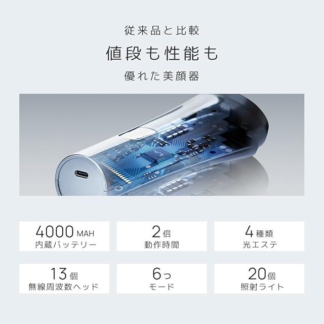 【USB充電・お持ち便利】本製品に付属のUSBケーブルを使って、USB用ACアダプターに接続すれば、場所を取らずどこでも充電ができます。また、4000mAh大容量バッテリー付き、満充電の状態で、約10時間ご利用いただけます。外出先でもすぐに電池切れを心配することなく持ち運べます。製品の重量はわずか約246.6gとコンパクトで、持ち運びやすく、お宅だけでなく、旅行先や出張先、更に海外でも手軽にスキンケアできます。
