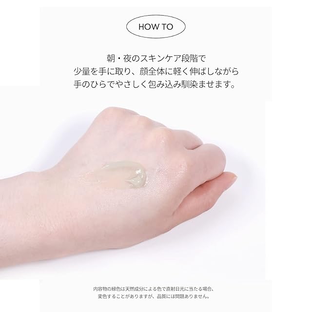 ?【使用方法】①いつも通りスキンケアをし、最後にクリームを適量手に取り、顔に塗布します。②手のひらで優しく包み込みしっかりなじませます。