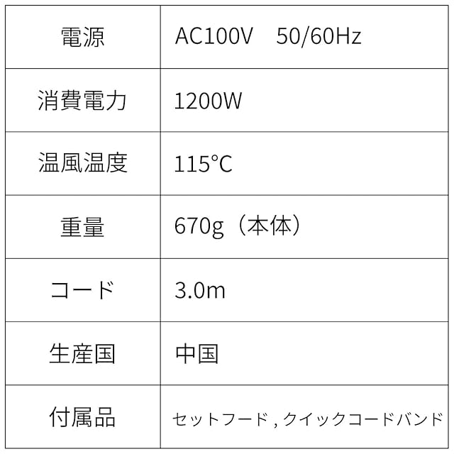 ? 本体質量:670g(フード別)。? 温風温度:115度(周囲温度30度の場合、フード無し、HIGH−温風時)。? 消費電力:1200W。? 電源:AC100V 50-60Hz。? コードの長さ:3.0m。? 風量切替:HIGH/LOW/OFF。? 即冷スイッチ:スライドロック式。? 期間:半年(6ヵ月)? 生産国:中国。