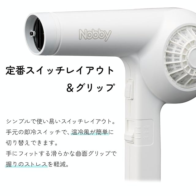 ?定番スイッチレイアウト&グリップ。シンプルで使い易いスイッチレイアウト。手元の即冷スイッチで、温冷風が簡単に切り替えできます。また、手にフィットする滑らかな曲面グリップで、握りのストレスを軽減。?即冷スイッチ 。手元の即冷スイッチで、温冷風が簡単に切り替えられます。 仕上げのクールショットでセット力がアップします。?電源コード引き抜きをラクにする、 ラク抜きプラグ コード抜き差しの多いサロンワークで活躍。 プラグのレバーを押すだけでカンタンにコンセントから引き抜くことができます。?付属品:セットフード1個、クイックコードバンド。