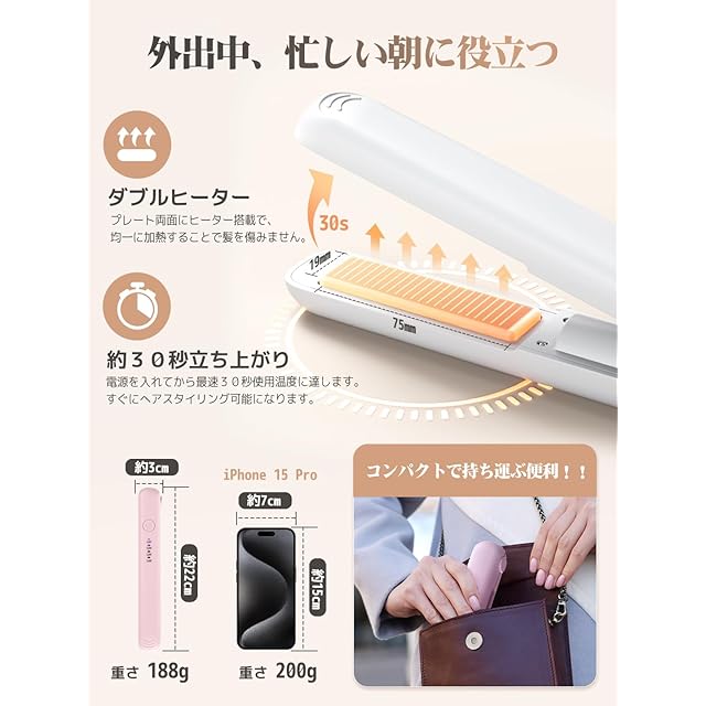 【最速の立ち上げ時間 】ダブルPTCヒーターを搭載し、時間がない時でも約30秒で急速加熱で、使用開始可能となる。使いたいときにサッと使えるので便利。朝の忙しい時間に使う機会が多い方や、できるだけ短時間でクセを直したい方はこのコードレスヘアアイロンチェックしてみてください。
