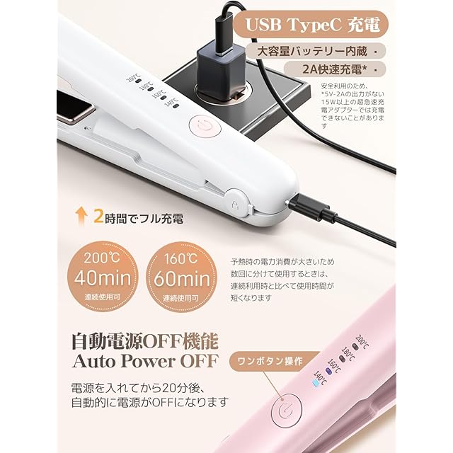 商品名:ヘアアイロン コードレス 2WAY カール/ストレートヘアアイロン 19mm プロ仕様200℃ TYPE-C充電 3200mAh大容量 140℃〜200℃4段階温度調整 自動電源OFF 開閉ロック ミニ 小型 持ち運び便利 男女兼用 家庭/旅行/出張/通勤用 贈り物 MONUSO (ホワイト)