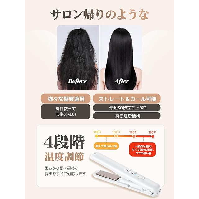 【4段階の温度調節】140℃/160℃/180℃/200℃の4段階の温度調節が可能。前髪をセットする際にヘアアイロンを使う場合は120〜140℃、カールスタイルを楽しむなら140℃前後、きれいなストレートヘアを実現したい方は160℃〜200℃といったように、髪の硬さや用途、髪の傷み具合に合わせて温度を変更可能です。髪をいたわりながら使いたい方も注目しておきたい機能です。