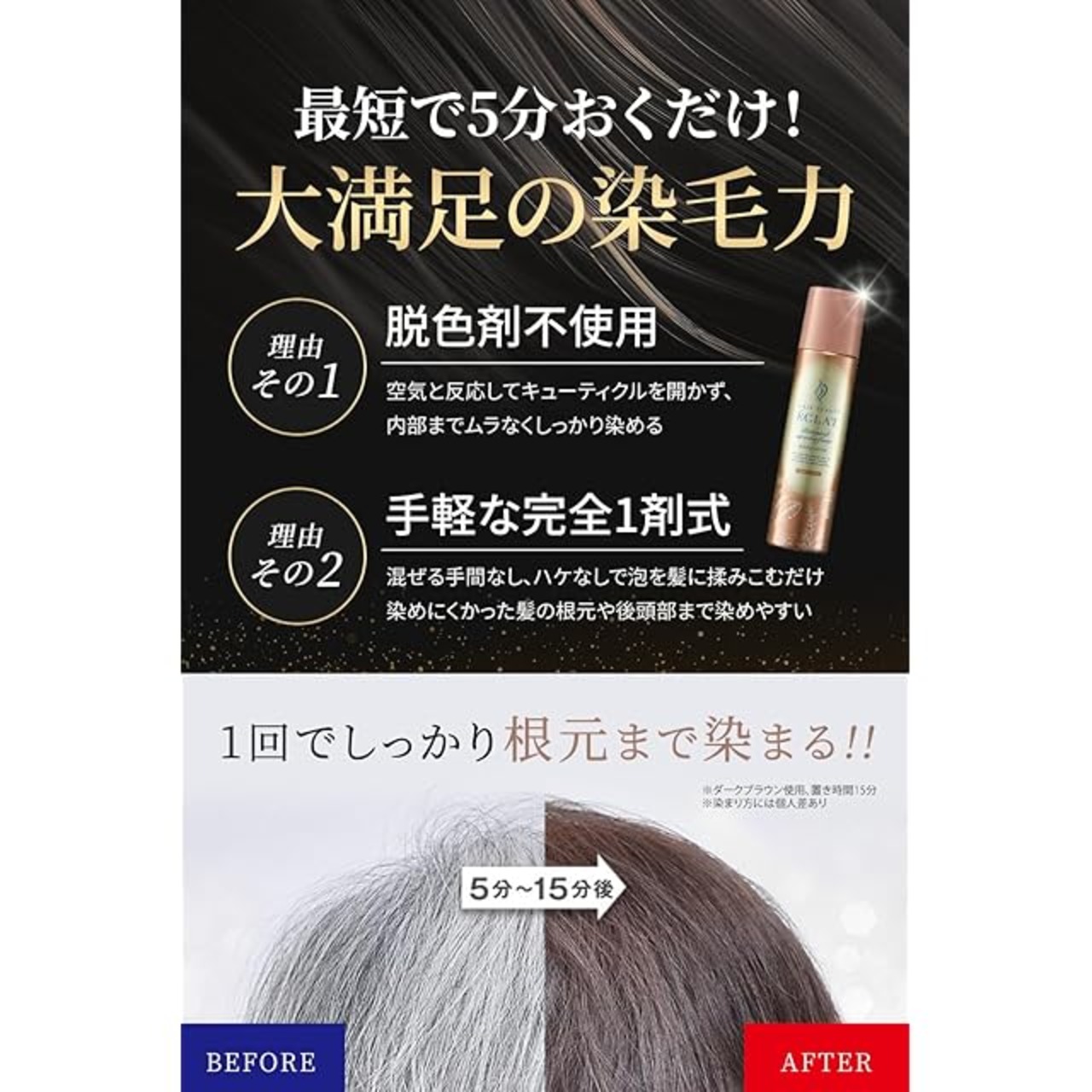 大人気「空気で染める」カンタン手軽な白髪染めがリニューアル! 「ヘアボーテエクラ ボタニカルエアカラーフォームEX」は、ワンプッシュでムースを出し、髪になじませて5分置くだけで白髪をムラなくつややかに染め上げます。脱色剤を一切使用しない処方で髪を傷めにくい処方はそのままに、ハリ・コシ成分として加水分解ケラチンを配合。ダメージ髪をケアし、色持ちアップにも。もちろん、うるおいを与えるボタニカル成分や10種の和漢植物エキスも配合、ツヤとうるおいを与えて美しく輝く美髪を育みます。 さわやかなフレッシュグリーン香りで、ツンとくる刺激臭も気にならず、ストレスなくホームカラーリングをお楽しみいただけます。