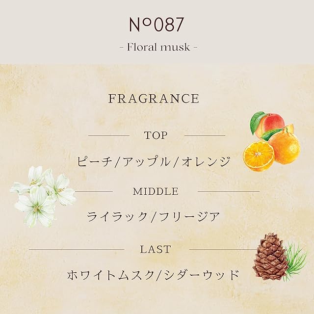 【Incense tone:香調】 ● No.087 [TOP]:ピーチ、アップル、オレンジ/[MIDDLE]:ライラック、フリージア/[LAST]:ホワイトムスク、シダーウッド