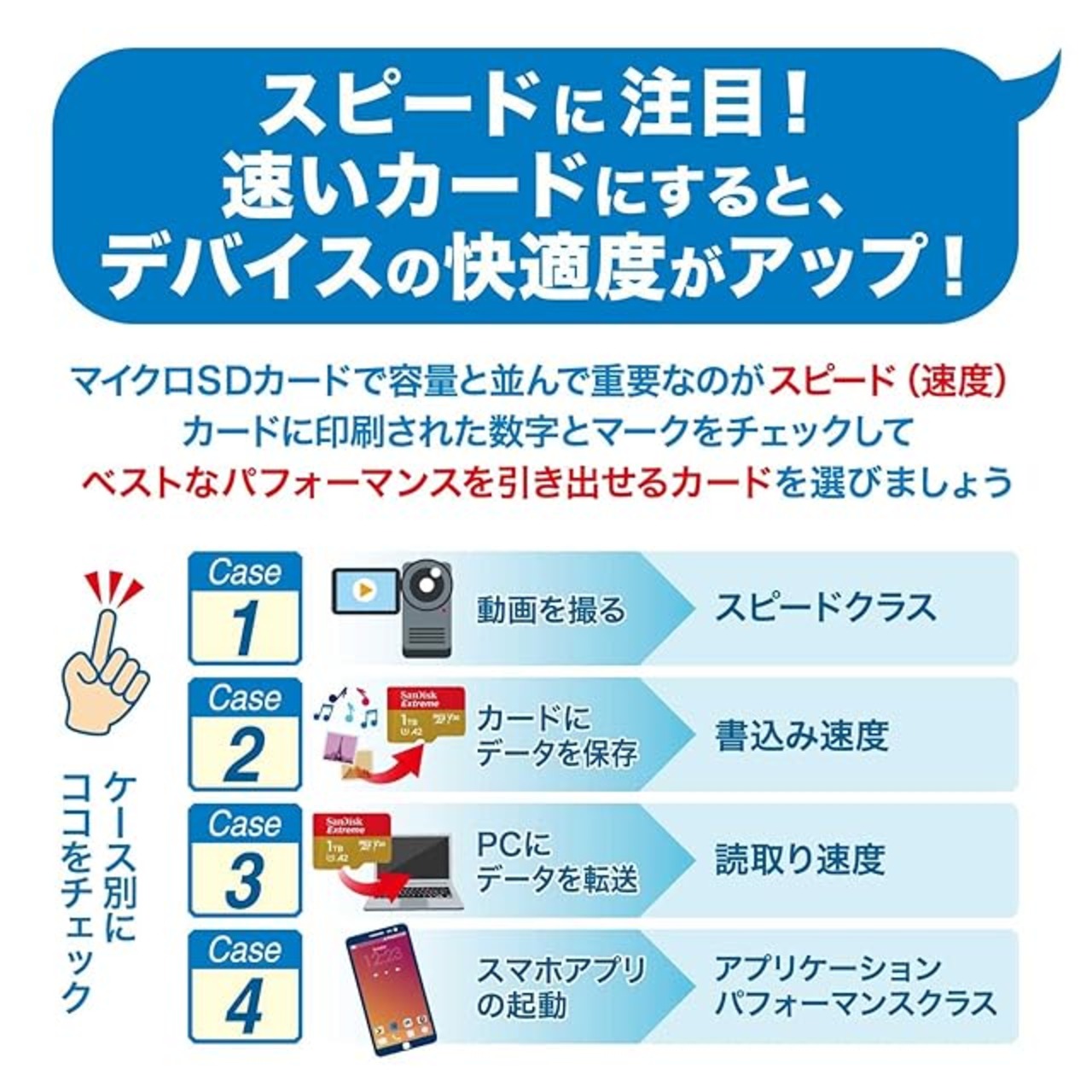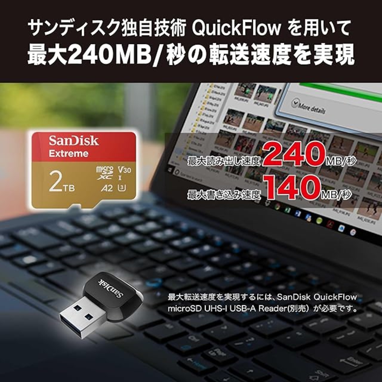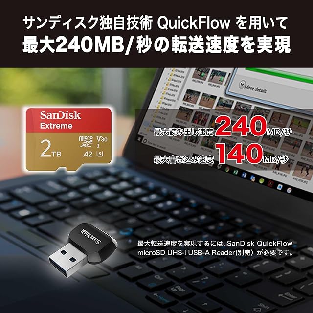 スピードの限界を 打ち破る。SanDisk QuickFlow microSD UHS-IカードUSB-Aリーダー(別売り)と併用すると、最大240MB/秒2の読み出し速度と最大140MB/秒2の書き込み速度で、貴重な瞬間を保存することができます。
