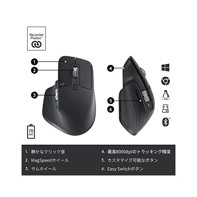 商品名:ロジクール MX MASTER3s アドバンスド ワイヤレス マウス 静音 MX2300GR Logi Bolt Bluetooth Unifying非対応 8000dpi 高速スクロールホイール USB-C 充電式 無線 MX2300 グラファイト 国内正規品