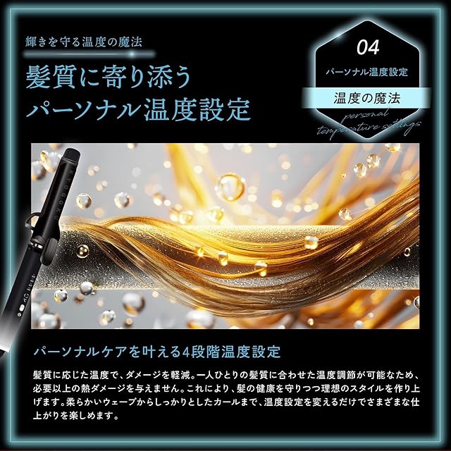 【4段階の温度調整機能(140〜200℃)】 髪質やスタイリングの目的に応じて140℃、160℃、180℃、200℃の4段階で温度設定が可能。細い髪やダメージが気になる方には低温設定、しっかりとしたカールを長時間キープしたい方には高温設定がおすすめ。温度を自由に調整することで、熱ダメージを抑えつつ、ナチュラルな仕上がりからしっかりとした巻き髪まで自在にスタイリングが可能です。