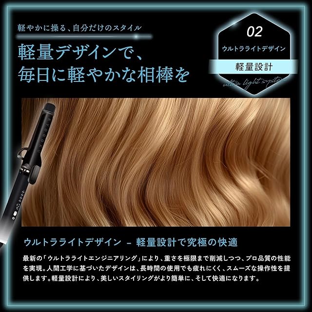 【軽量&スムーズな操作性】最新のウルトラライトデザインを採用し、長時間の使用でも手が疲れにくい軽量設計を実現。持ちやすさを追求したグリップと滑らかな操作感により、ストレスなくスタイリングが可能。さらに、高性能ヒーターを搭載し、素早い立ち上がりを実現。忙しい朝でもすぐに使用できるため、時短スタイリングに最適。髪をスムーズに巻けることで、仕上がりのムラを防ぎ、プロのような美しいカールを簡単に作ることができます。