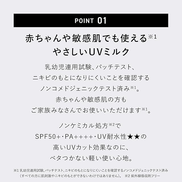 ノンケミカル処方でSPF50+・PA++++の高いUVカット効果のあるUVミルクがアップデート!うるおいと輝きのあるツヤ肌が実現する成分を配合。透明感とキメが整い光の効果でトーンアップし、紫外線や環境ストレスからも肌を守れるだけでなく、肌にやさしい石けんオフも実現します。