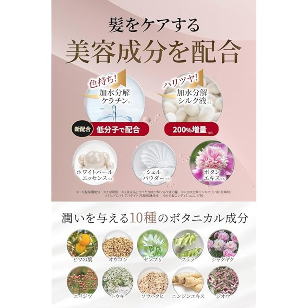 大人気「空気で染める」カンタン手軽な白髪染めがリニューアル! 「ヘアボーテエクラ ボタニカルエアカラーフォームEX」は、ワンプッシュでムースを出し、髪になじませて5分置くだけで白髪をムラなくつややかに染め上げます。脱色剤を一切使用しない処方で髪を傷めにくい処方はそのままに、ハリ・コシ成分として加水分解ケラチンを配合。ダメージ髪をケアし、色持ちアップにも。もちろん、うるおいを与えるボタニカル成分や10種の和漢植物エキスも配合、ツヤとうるおいを与えて美しく輝く美髪を育みます。 さわやかなフレッシュグリーン香りで、ツンとくる刺激臭も気にならず、ストレスなくホームカラーリングをお楽しみいただけます。
