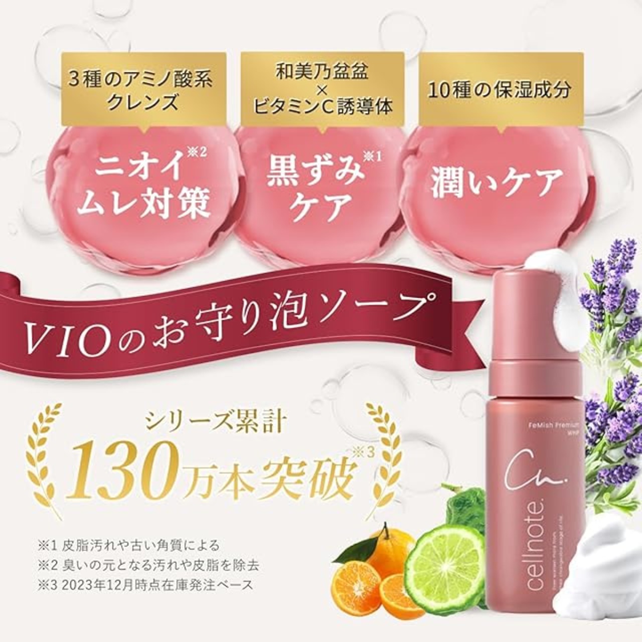 【 VIOのお守り泡ソープ 】?ニオイ:アミノ酸系の3種のベタイン洗浄成分が、においの元となる汚れや皮脂を除去。 ?カサつき:ヒアルロン酸&3種のセラミドがうるおいバリアをサポート。?黒ずみ(※洗浄による皮脂汚れや古い角質による): 摩擦レスの泡&和美野盆盆×ビタミンC誘導体で、蓄積くすみに透明感を ?ムレ:精油が、ムレを優しく和らげます。