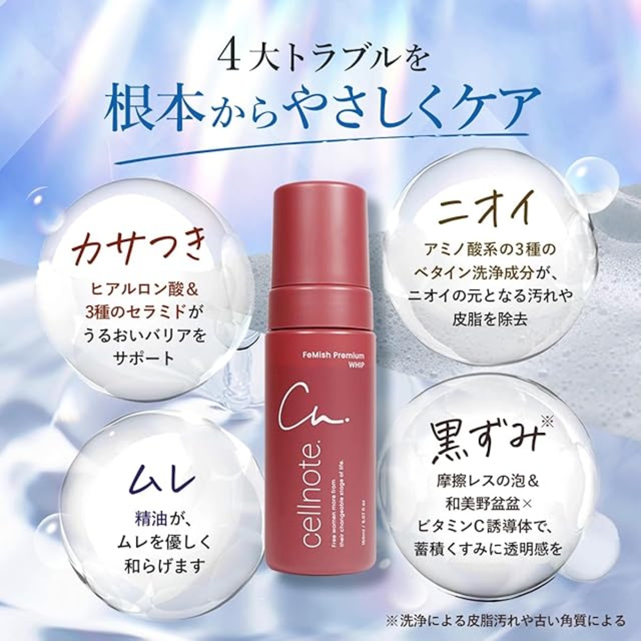 商品名:cellnote. FeMish Premium WHIP フェミッシュプレミアムホイップ デリケートゾーン用泡フォーム セラミド コメヌカエキス ビタミンC誘導体 弱酸性 スウィートピーチミルクの香り 150ml (ボトル)