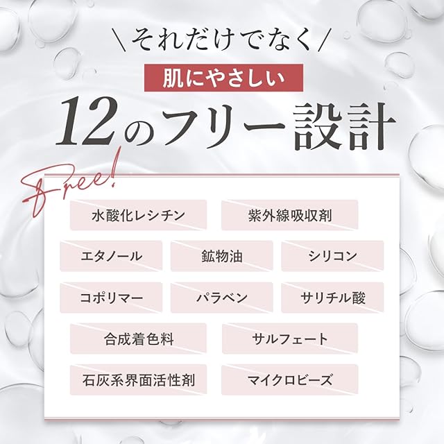 【 肌に優しい12のフリー設計 】水酸化レシチン・紫外線吸収剤・エタノール・鉱物油・シリコン・コポリマー・パラベン・サリチル酸・合成着色料・サルフェート・石油系界面活性剤・マイクロビーズ