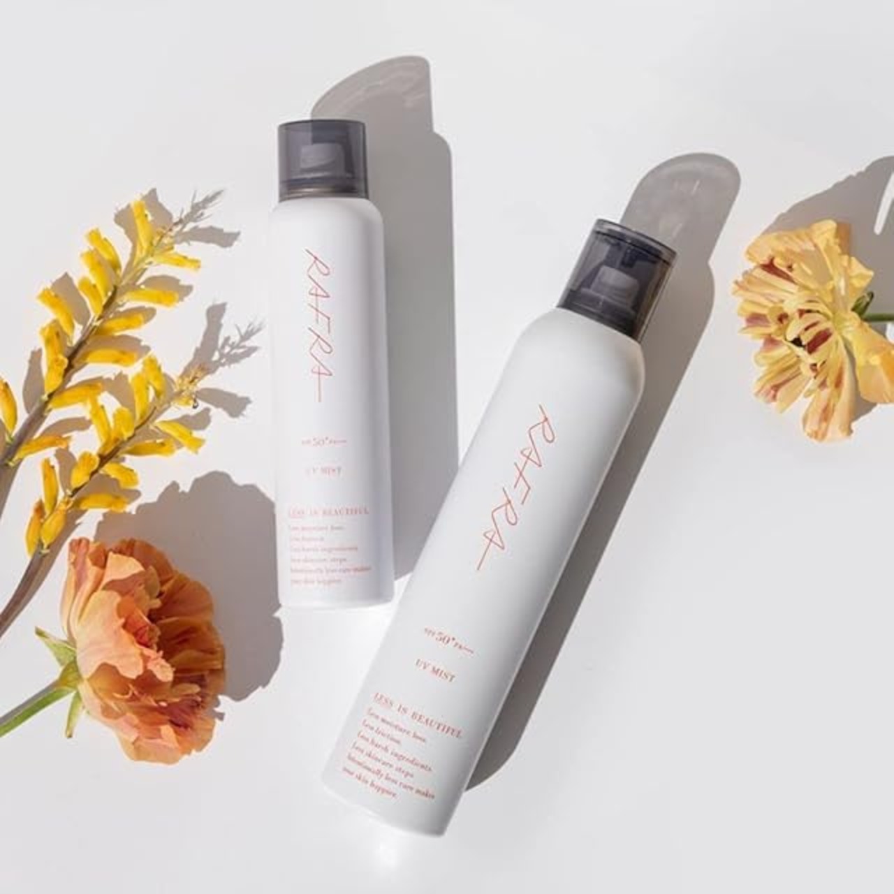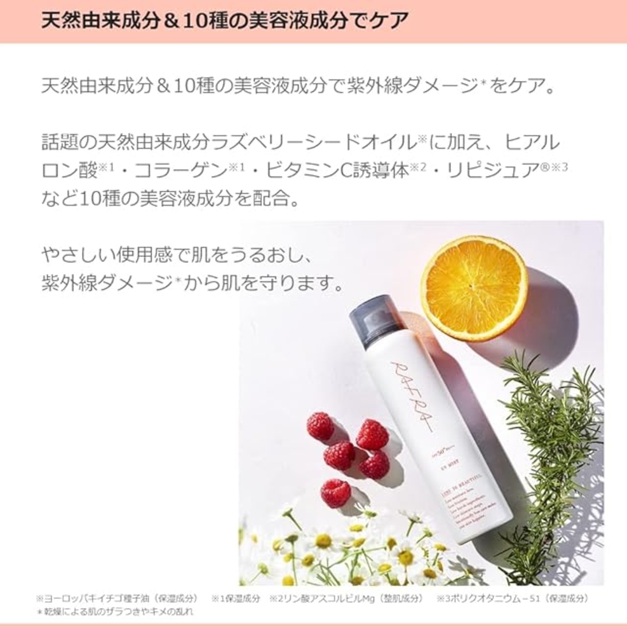 最強*の紫外線カット効果(SPF50+、PA++++、ロングUVA対応)に加え、大気汚染、ブルーライトから肌を守る美容液UVミスト。マンダリンクリア※、ヒアルロン酸※1、コラーゲン※1、ビタミンC誘導体※2など10種以上の美容液成分が、使うたび肌にうるおいを与えます。ベタつかないサラサラとした使い心地。重ねても白くならない透明タイプなので、日中の塗り直しに便利。逆さでも使えるため、手の届きにくい背中や首の後ろにも。汗や水に強いウォータープルーフ仕様なのに、せっけんでするりと落とせるのでお子さまにもおすすめです。日焼け止め独特のニオイを抑えた、爽やかな天然オレンジの香り。※マンダリンオレンジ果皮エキス(整肌成分) ※1保湿成分 ※2リン酸アスコルビルMg(整肌成分) *ラフラ商品中最高のUVカット効果