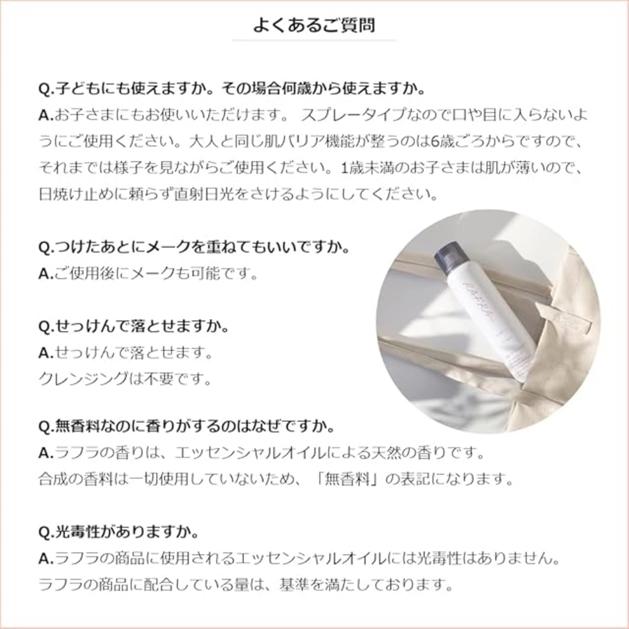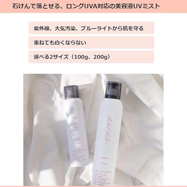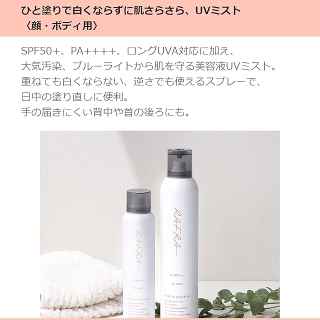 商品名:ラフラ 日焼け止めスプレー 100g UVミスト SPF50+ PA++++ (ロングUVA対応 UVスプレー 顔用 髪用 全身用 汗に強い 子供)