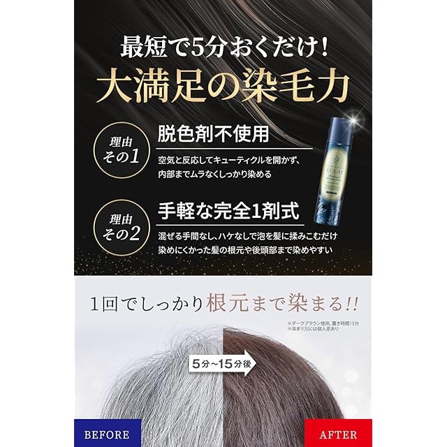 大人気「空気で染める」カンタン手軽な白髪染めがリニューアル! 「ヘアボーテエクラ ボタニカルエアカラーフォームEX」は、ワンプッシュでムースを出し、髪になじませて5分置くだけで白髪をムラなくつややかに染め上げます。脱色剤を一切使用しない処方で髪を傷めにくい処方はそのままに、ハリ・コシ成分として加水分解ケラチンを配合。ダメージ髪をケアし、色持ちアップにも。もちろん、うるおいを与えるボタニカル成分や10種の和漢植物エキスも配合、ツヤとうるおいを与えて美しく輝く美髪を育みます。 さわやかなフレッシュグリーン香りで、ツンとくる刺激臭も気にならず、ストレスなくホームカラーリングをお楽しみいただけます。