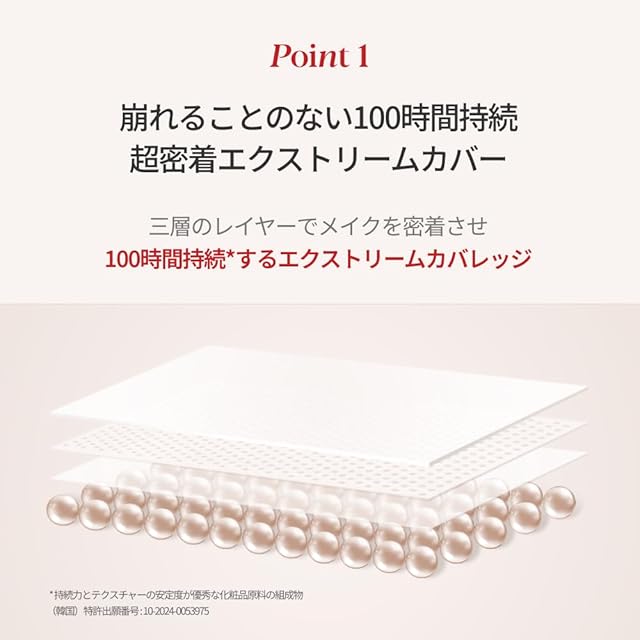 ダークニングなしに100時間持続 : どんなメイクでも凝りなく、浮き上がらず肌に密着します。アモーレパシフィックの特許技術を適用したトリプルレイヤーフィルムフォーマーがメイクアップを完璧に施し、汗や皮脂などにも崩れず、長時間メイクアップを維持します。
