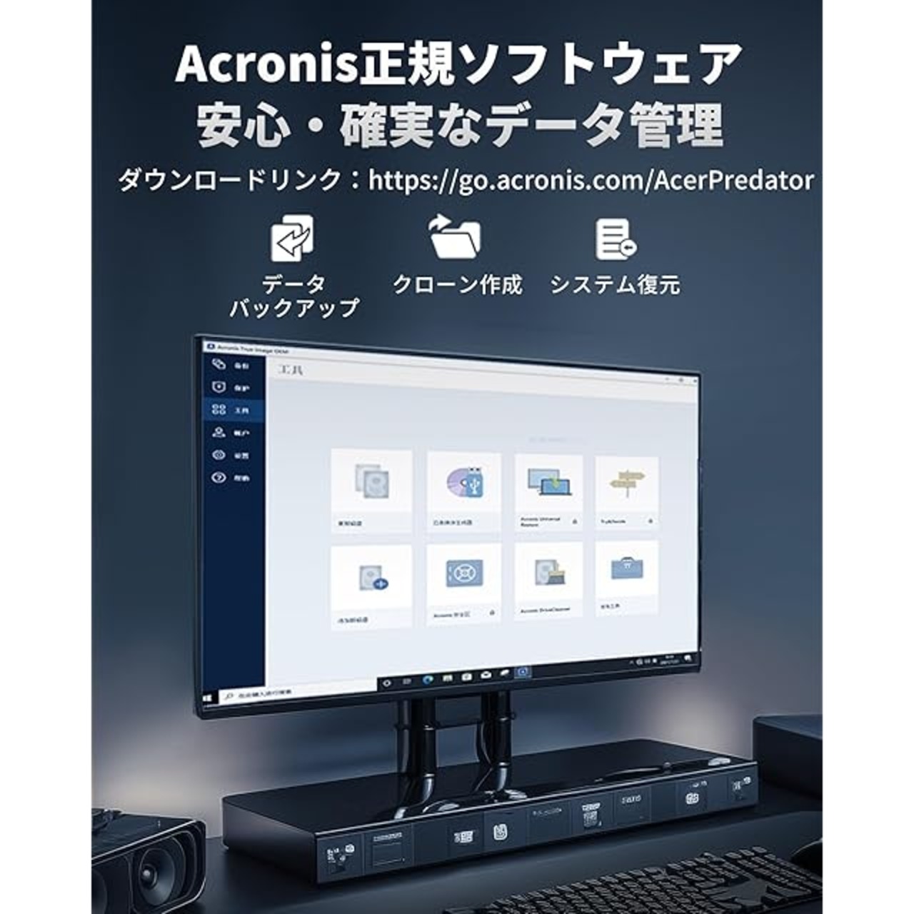 【Acronisソフトウェアを無料提供】Acronis系のソフトウェアは世界的に有名なバックアップソフトであり、それを通じて、誰でも簡単にパソコンのデータをバックアップすることができます。SSDを換装する時にOSやソフトなどの再インストールが必要なし。※Predator SSDシリーズ商品のユーザーに無料で提供いたします。