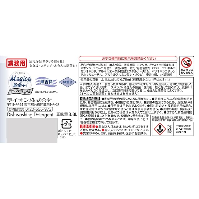 商品名:チャーミー マジカ(CHARMY Magica) 【業務用 大容量】 除菌プラスプロフェッショナル 無香料3.8L 詰め替え 食器用洗剤 台所洗剤 中性洗剤