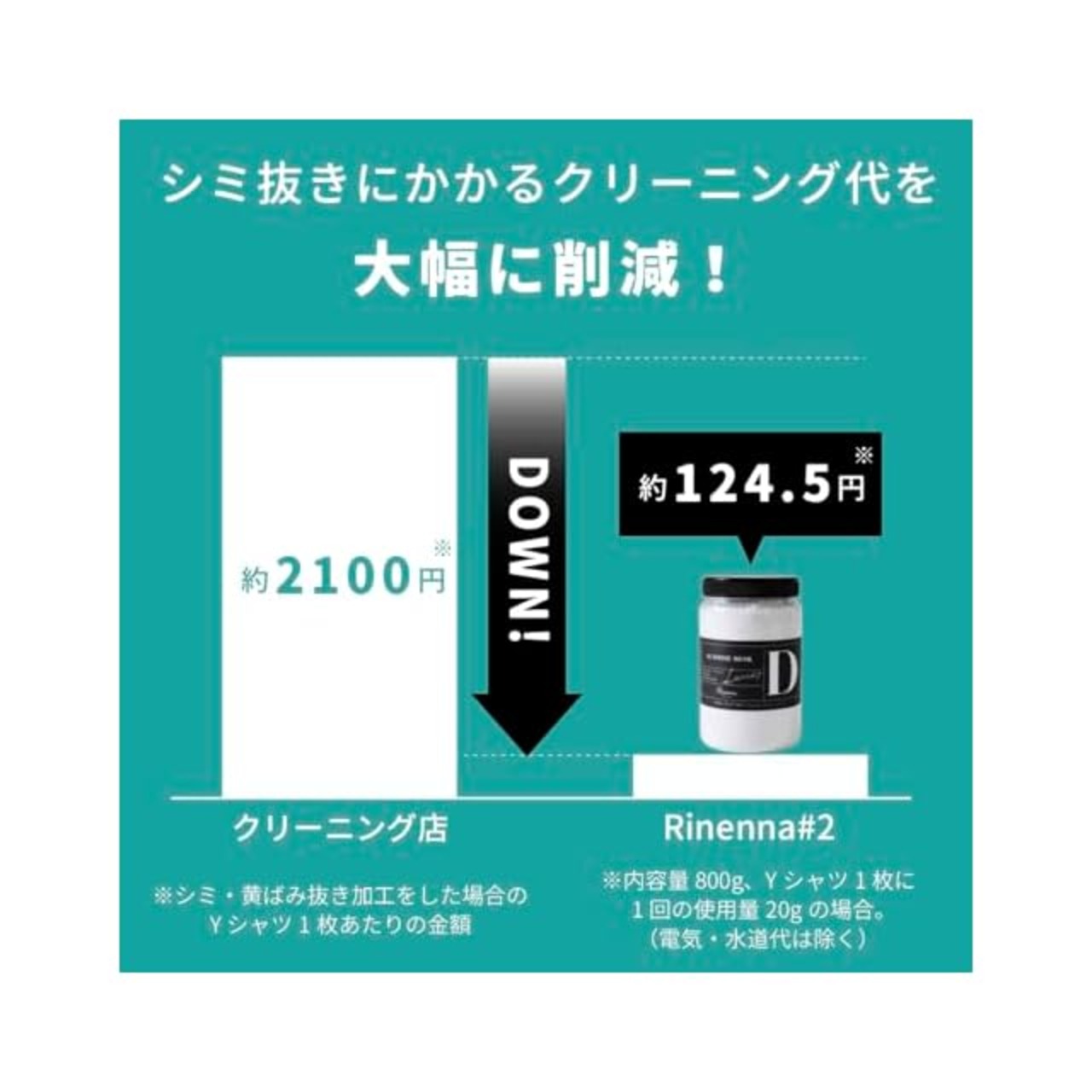 <b>【加齢臭・くさいニオイをごっそり落とす洗剤 Rinenna#2】</b><br>Rinenna#2は、特に加齢臭などのニオイや汚れにフォーカスした洗濯洗剤です。<br>面倒なもみ洗いの時間を減らし、つけ置きすることで、衣類のニオイや汚れを落とします。<br>蓋を開けるたびに、お洗濯をするたびにふわっと広がるWhite Muskの香り。<br>家事をしているのにホッと癒されます。<br><br><b>【つけ置きしたあと洗濯機にかけるだけ】</b><br>ニオイ・黄ばみ・黒ずみは、身体から出るタンパク質が原因。<br>皮脂汚れは落としても、タンパク質の汚れを落とさなければ、黒ずみや黄ばみの原因になります。<br>Rinenna#2は、このタンパク質の汚れに着目し、タンパク質分解酵素を究極にブレンドしています。<br><br><b>【洗い分ける必要はないんです】</b><br>家族全員の洗濯物のいやなニオイ (加齢臭) もひとつで簡単に落とせ、汚れによって洗剤を変える必要がありません。<br>漂白剤や専用洗剤などを併用することなく、これ一つでしっかりとニオイも汚れも除去することができます。<br><br><b>【洗濯槽もピカピカに】</b><br>浸け置きした後、液剤と一緒に洗濯機に入れて普通に洗濯機を回すだけで洗濯槽が綺麗になります。<br>繰り返しお使いいただくと、洗濯槽のカビ臭・汚れを防ぐとともに、洗濯槽の洗浄・抗菌効果もあります。<br><br><b>【内容量】</b><br>800g<br><br><b>【香り】</b><br>ホワイトムスク<br><br><b>【液性】</b><br>アルカリ性<br><br><b>【標準使用量】</b><br>水30Lに対して30g<br><br><b>【製造元】</b><br>日本