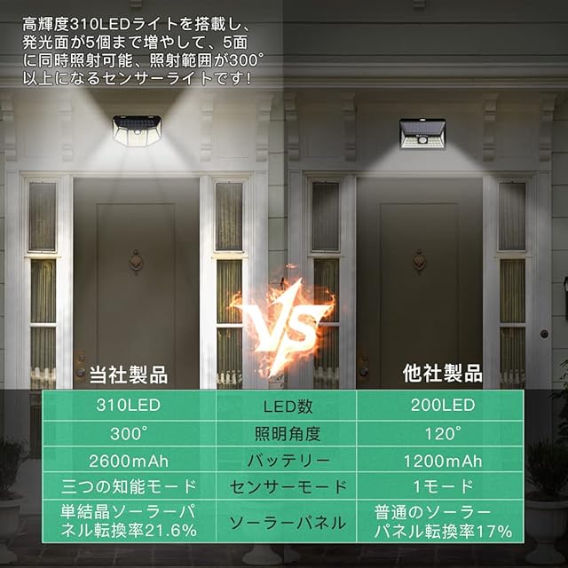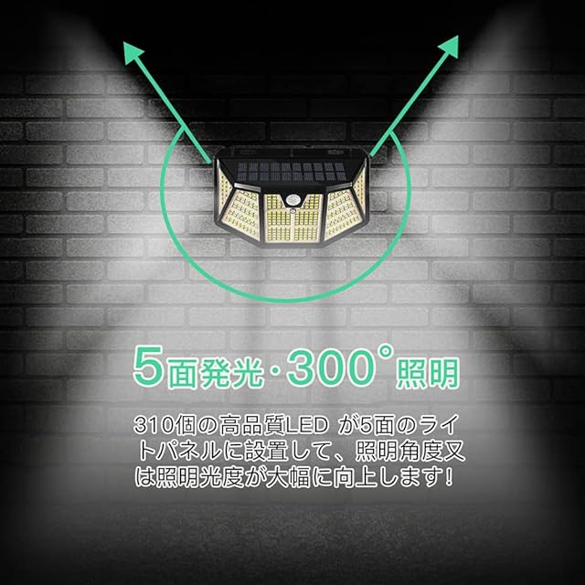 【高輝度LEDで広範囲を明るく照らすソーラーライト】310個の高輝度LEDチップを搭載し、5方向同時照射で300°の広範囲を均一に照らします。従来品よりも発熱が少なく、低赤外線・低UV設計で虫が寄り付きにくいソーラーライトです。さらに、160°の広角センサーを採用しており、従来の120°屋外 センサーライトよりも広い範囲で不審者を威嚇できます。