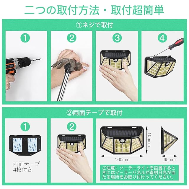 【充実のセット内容で即設置可能】パッケージ内容:ソーラーセンサーライト×2、ネジ×4、両面テープ×4、取扱説明書×1。2個セットなので、玄関と階段、庭と駐車場など、複数の場所に同時に設置可能。面倒な配線工事不要で、すぐに使える防犯・防災用のセンサーライトです。