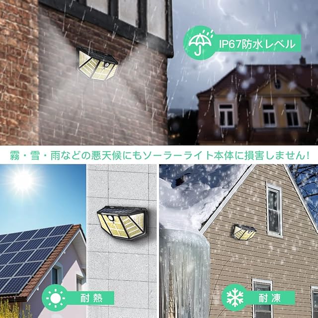 【IP67防水設計で屋外設置に最適】IP67レベルの完全防水防塵設計で、雨・雪・霧などの悪天候にも安心。玄関、ガーデン、廊下、駐車場、階段周りなど、さまざまな屋外環境で活躍するソーラーセンサーライトです。225gの軽量設計で、付属のネジと強力両面テープを使えば、女性でも簡単に設置できます。