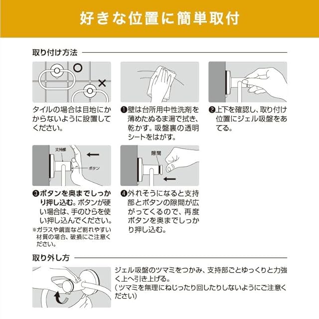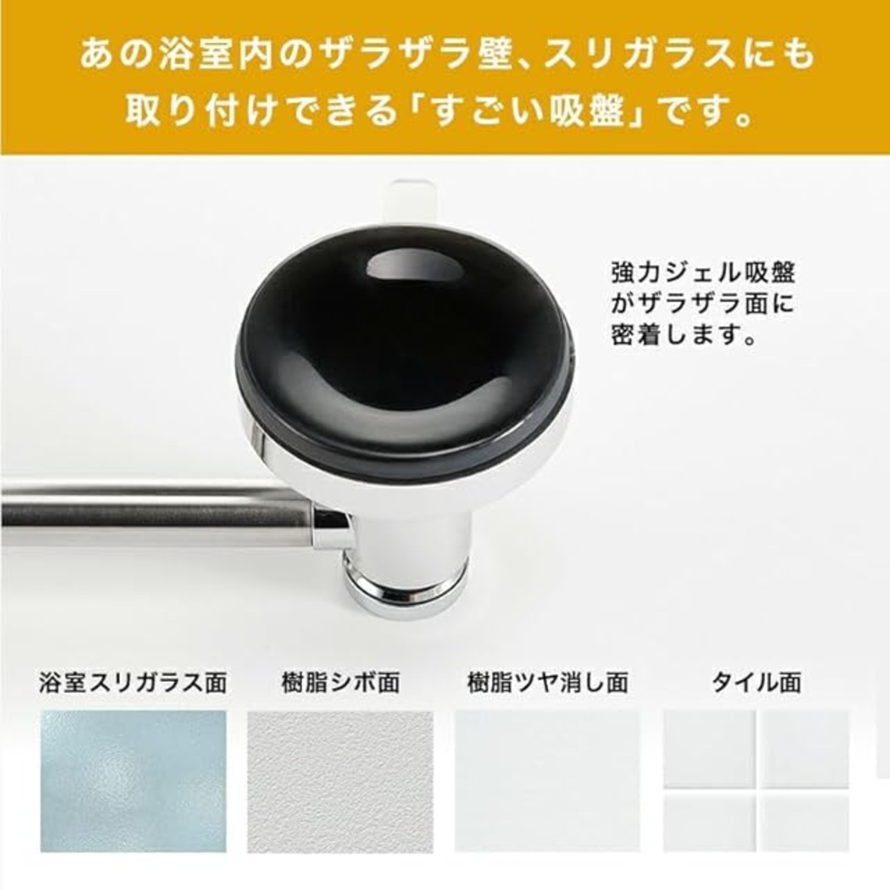 すごい吸盤を採用!やわらかいジェルが、浴室内の細かい凹凸・シボ面にもしっかり密着する吸盤です。