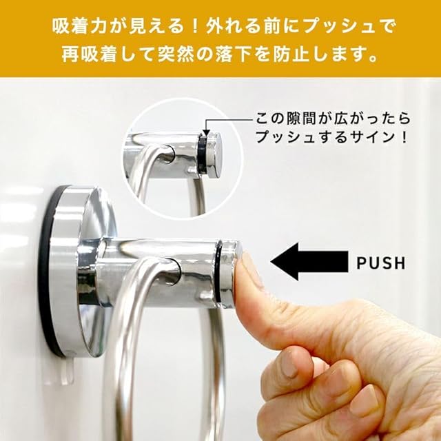 取付方法は押すだけ。再びプッシュすると吸着力が復活する、落下防止機能付きです。