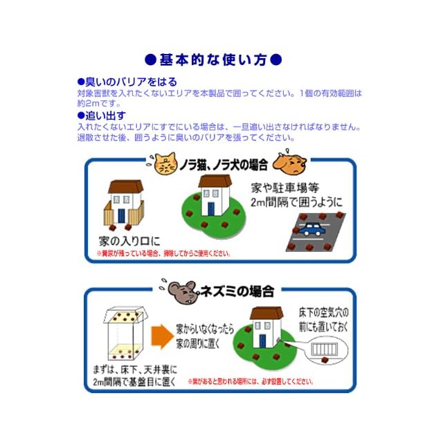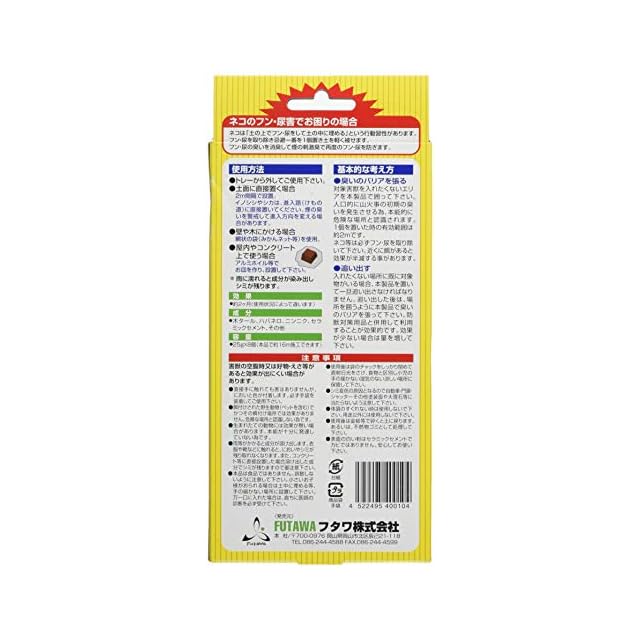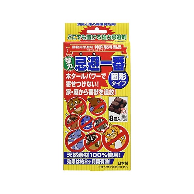 ●どこでも置ける固形タイプで、害獣を嫌な臭いで寄せ付けません。●【用途】●木タールパワーで寄せ付けない。家、庭から害獣を追放。●【機能・特徴】●天然素材100%で安心安全です。●効果は約2か月間です。●【仕様】●効果:約2ヶ月(使用状況によって異なります)。●容量:25g×8個。●【材質】●木酢液、木タール、ニンニク、セラミックセメント。●【商品サイズ】幅95×高さ227×奥行27mm 重量210g●商品コード:4522495400104●JANコード:4522495400104●ブランド名:フタワ●商品名:忌避一番固形●規格:25gx8pcs●【注意事項ほか】●直接手に触れても害はありませんが、臭いと色が付着します。手袋を装着してご使用下さい。●小さいお子様がおられる場合は、土中に埋めるなど手の届かない場所に設置して下さい。保管場所にも気をつけて下さい。口に入れた場合は直ちに医師の診断を受けてください。●使用後は金槌などで砕くと土に戻ります。または不燃物ゴミとして処理してください。表面の白い粉はカビではありません。安心してお使い下さい。