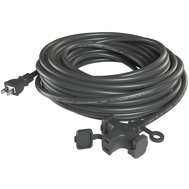 【注意事項】 ※このコードは合計1200W以下で使用して下さい。 ※この製品を濡れた手でのプラグなどの抜き差しは決してしないで下さい。 ※プラグはきっちりと差し込んでお使いください。接触不良で発熱する原因となります。 ※コードは束ねて使用したり、上から物を載せないで下さい。焼損の恐れがあり、火災の原因になります。 ※「防雨機能」が有効となるのは、ご使用される機器側も「*防雨対応の電源プラグ」である場合に限ります。