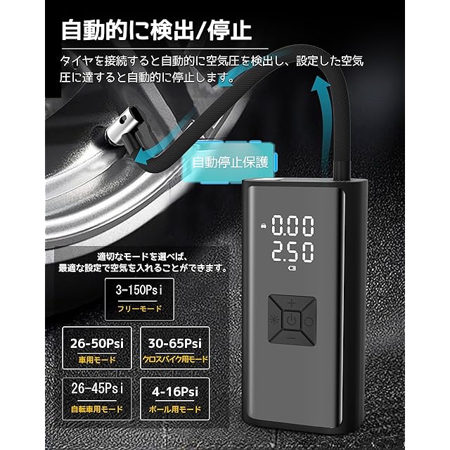 弊店の電動空気入れでは最先端モーター採用し、充填効率は従来より8倍向上しています。感知センサーと自動OFF機能を搭載し、予め空気圧をセットしておけば、 指定した空気圧になると自動停止します。