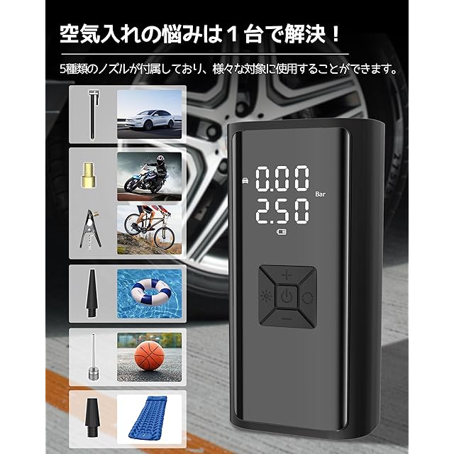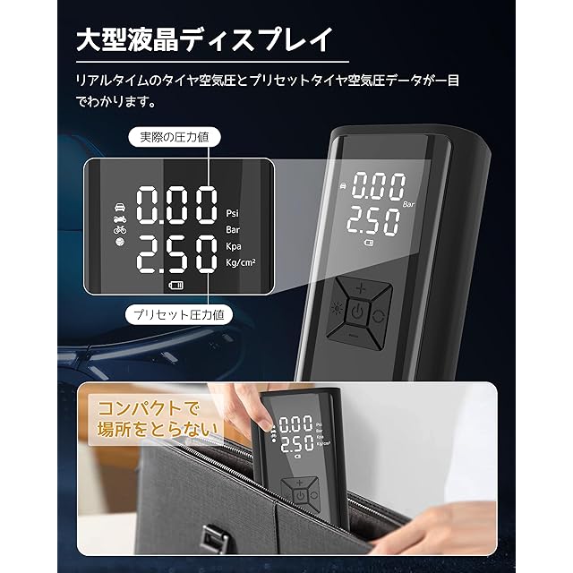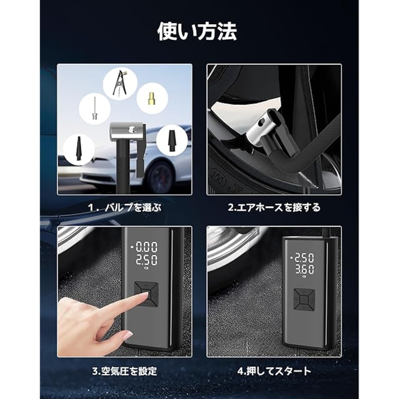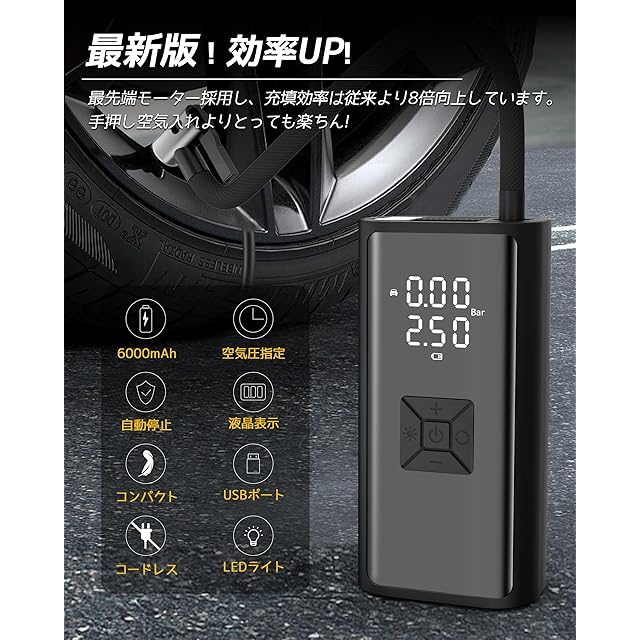 商品名:電動空気入れ 車 自転車 エアーポンプ 充電式 6000mAh コードレス 最大圧力150PSI バイクエアコンプレッサー 仏/英/米式バルブ対応 自動車/自転車/ボール/浮き輪
